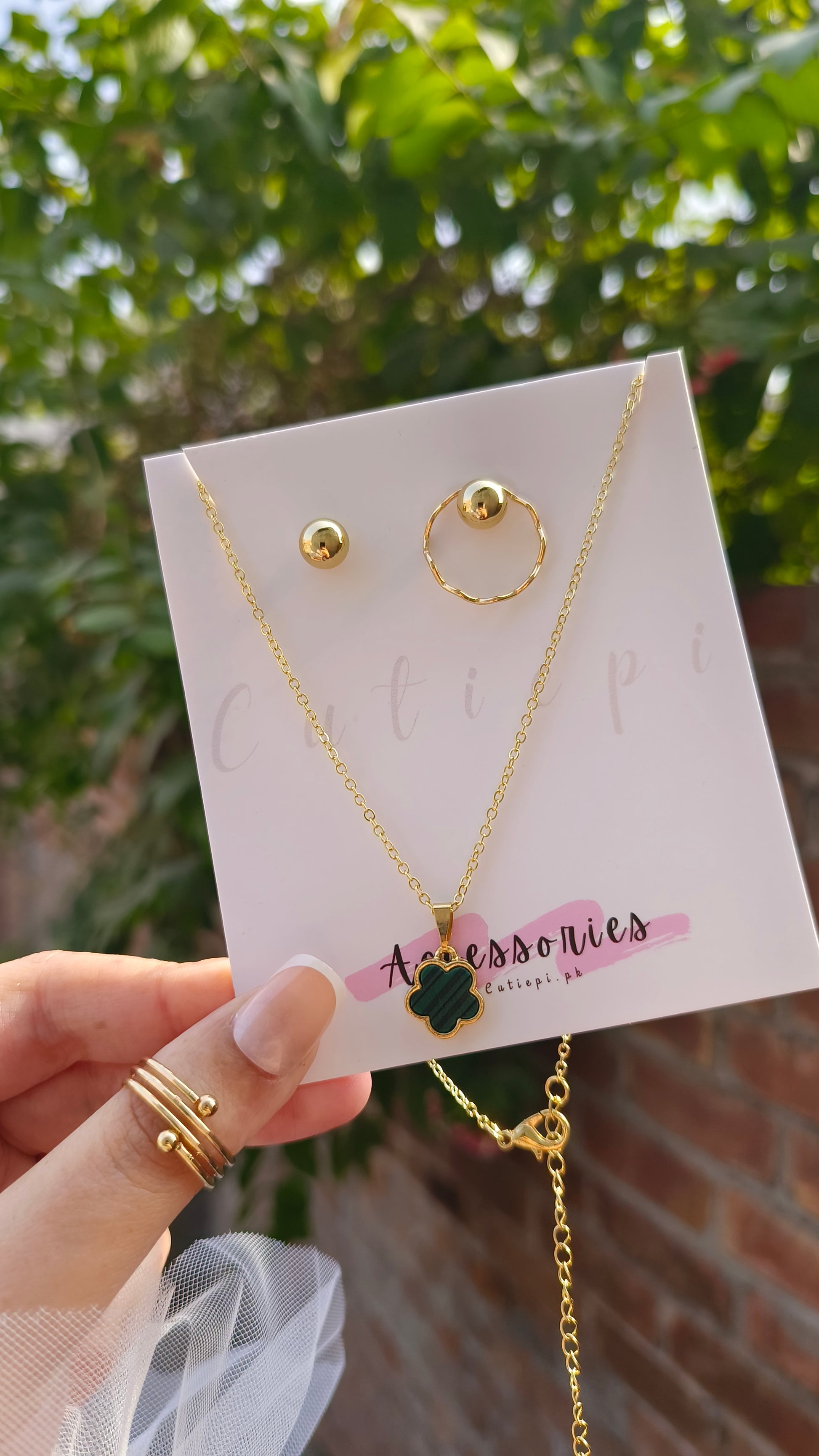 Add a touch of nature-inspired elegance to your look with this beautiful green clover pendant set. Featuring a vibrant green stone, this set is perfect for bringing a pop of color to any outfit. Its simple yet stylish design makes it a great addition to both casual and formal wear. Perfect for everyday elegance!